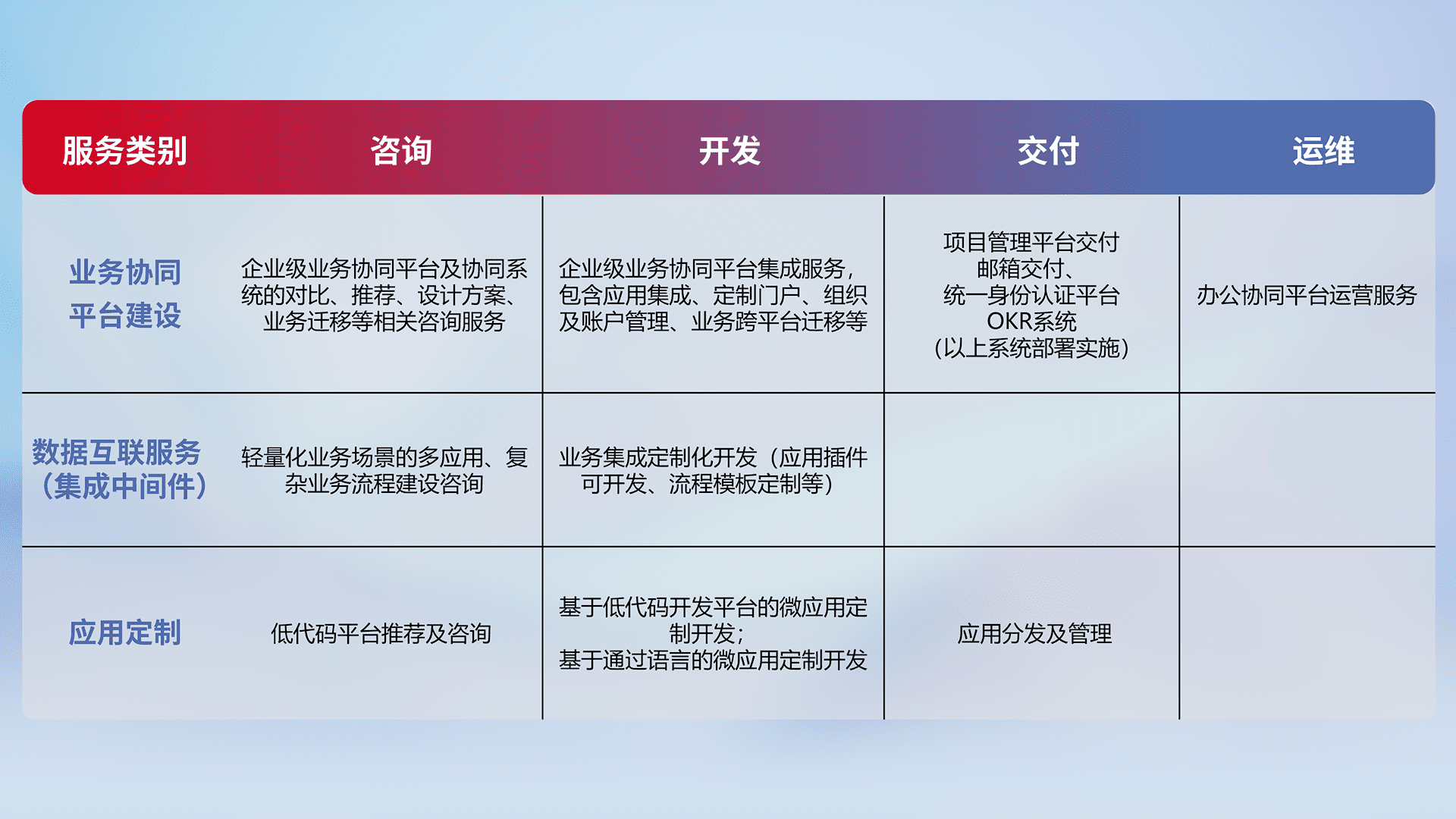 针对钉钉、、、企微、、、、IDaas等平台级产品提供产品的规划、、、方案、、、交付、、定制化开发等服务,,,,实现如统一协同办公、、、智能客户服务、、、、混合会议管理、、智能数据查询、、、、等业务场景,,,,实现数字化转型。。。。