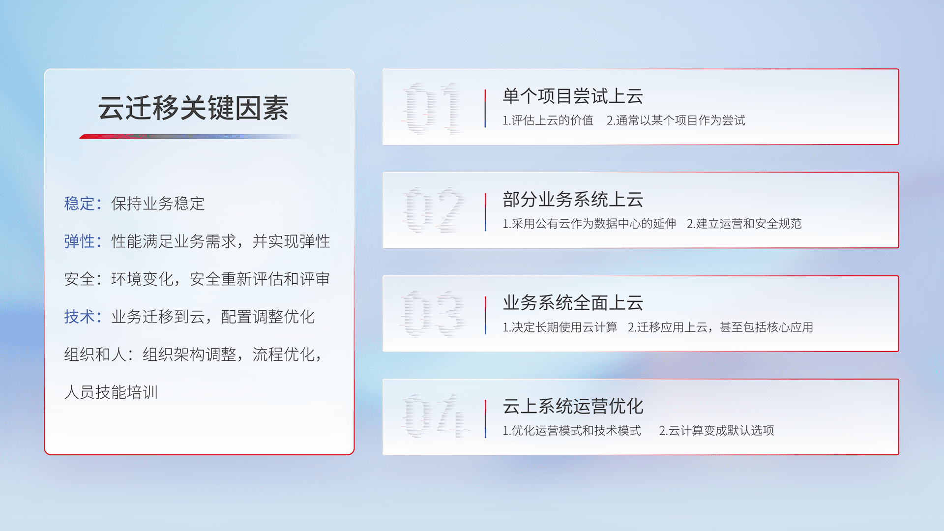 结合实际业务,,,,从规划设计、、、、云平台选型、、云原生改造、、、数据迁移、、、集成交付,,,,迁移全过程为客户识别最佳上云路径,,,做好风险识别管理,,,,设计网络架构、、、、身份权限、、、、安全审计合规、、、操作审计、、、日志审计、、、监控告警策略、、、、多站点容灾设计等,,对云上基础设施进行整体规划,,提升IT治理水平,,以满足弹性、、、高可用、、、高性能的需求。。。。