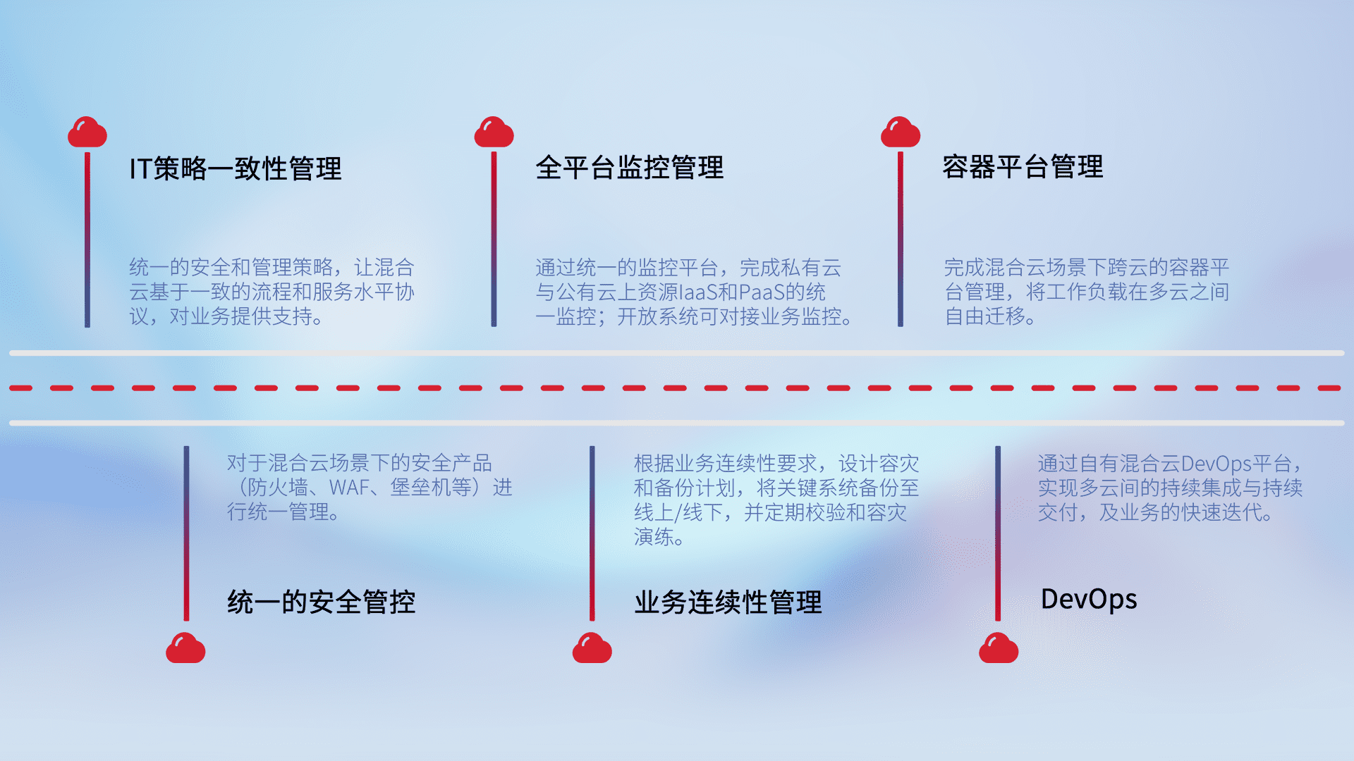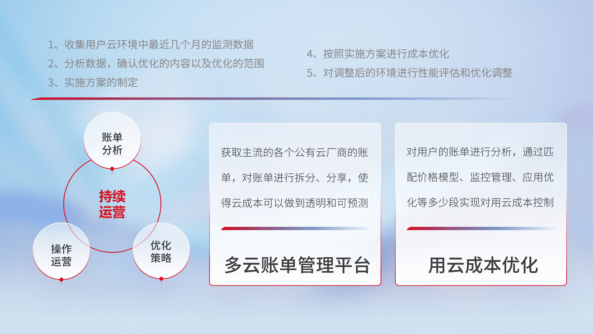 通过多云纳管,,以统一的资源数据模型把客户的云资源进行抽象和封装,,进而实现对多云资源的统一操作,,,保障云资源管理的可靠性、、稳定性与可用性。。。量身定制化运维内容,,配置、、、开发运维、、、、补丁管理、、备份、、、、监控、、、、认证和访问管理、、审计和日常巡检等,,,保障在用云过程中的可靠度,,稳定度以及高可用率。。。